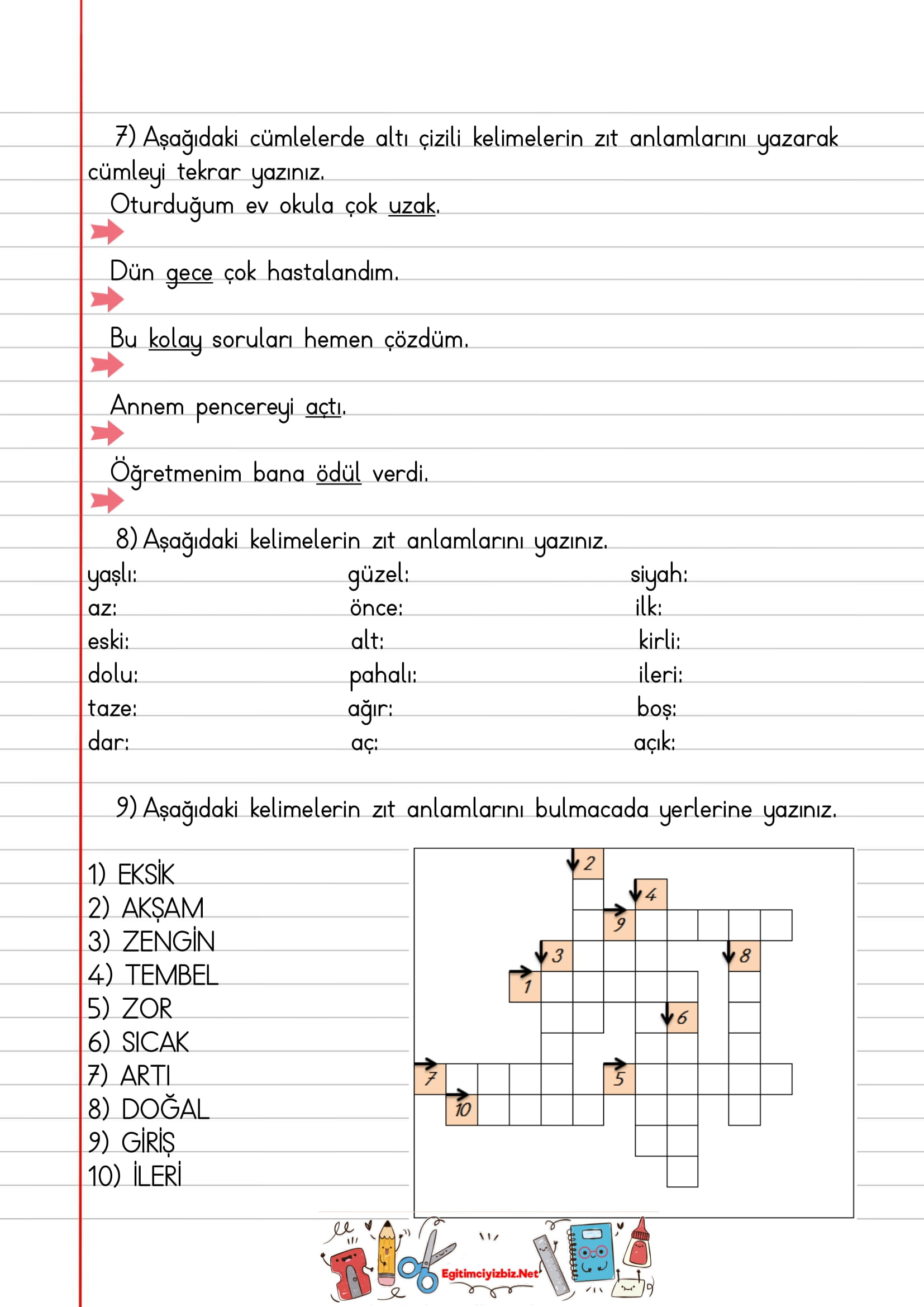 Okuma Anlama etkinliği ve zıt anlamlı kelimeler etkinliklerini içerir.