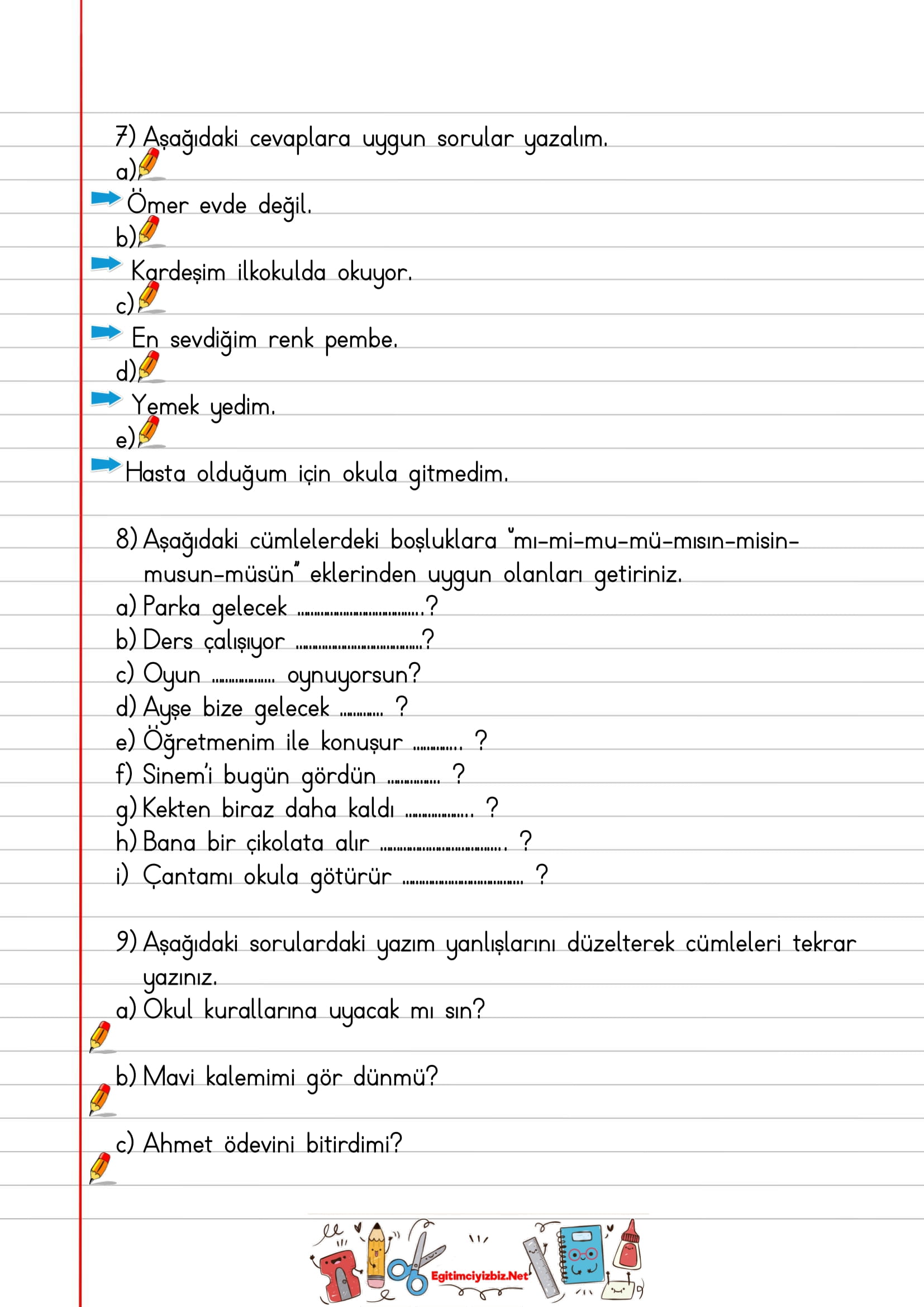 Okuma Anlama etkinliği, soru ekleri ve soru cümlesi oluşturma etkinliklerini içerir.