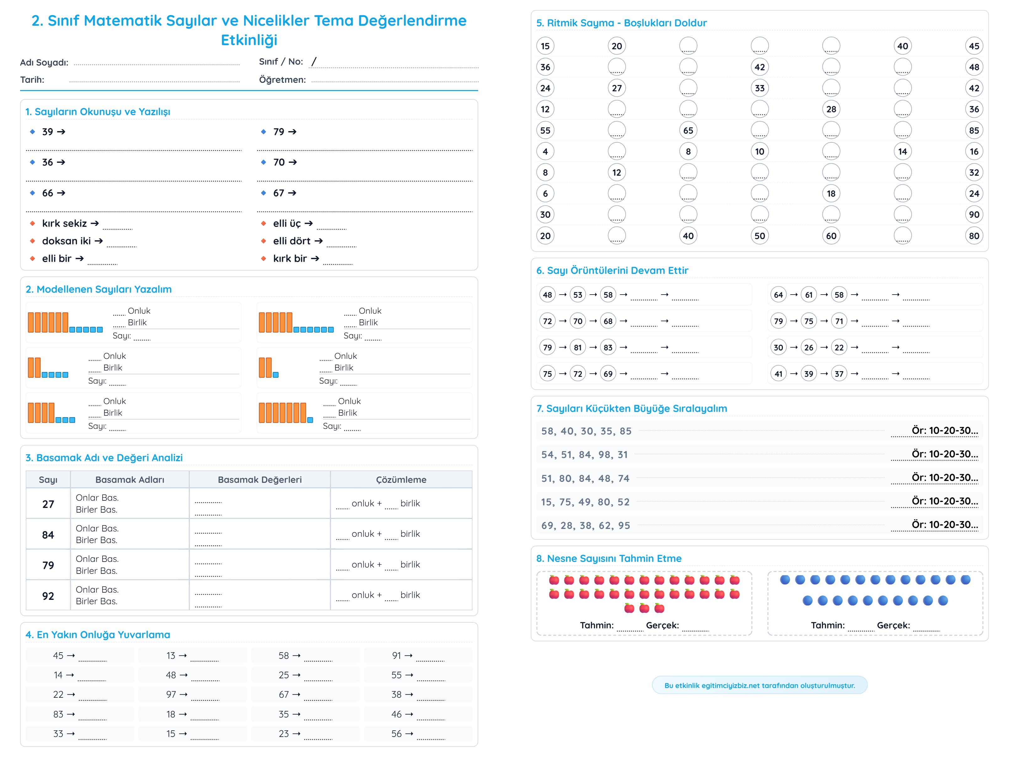 2. Sınıf Matematik Sayılar ve Nicelikler Tema Değerlendirme Etkinliği