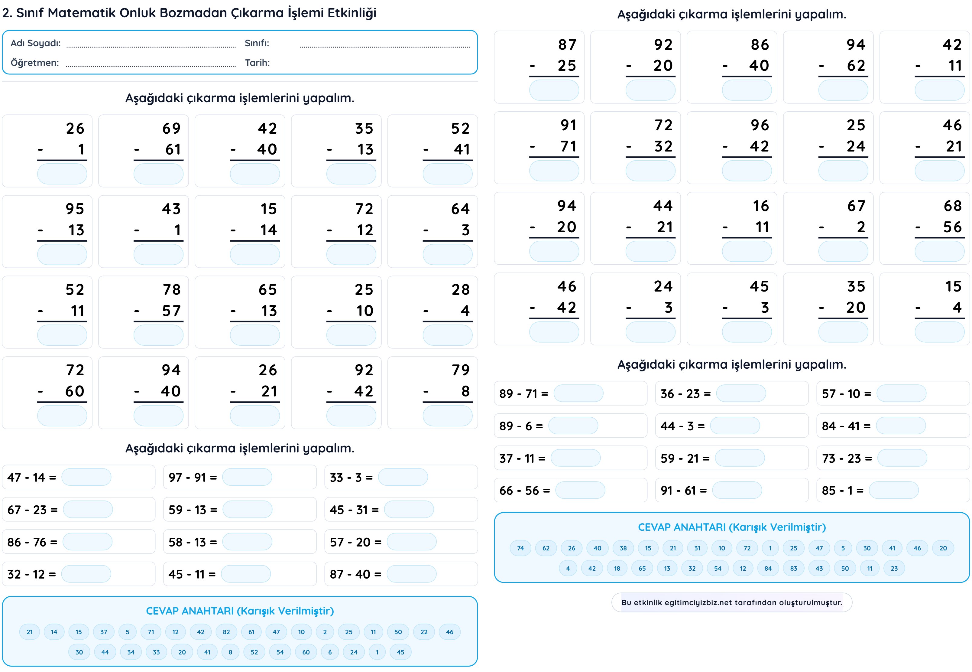 2. Sınıf Matematik Onluk Bozmadan Çıkarma İşlemi Etkinliği