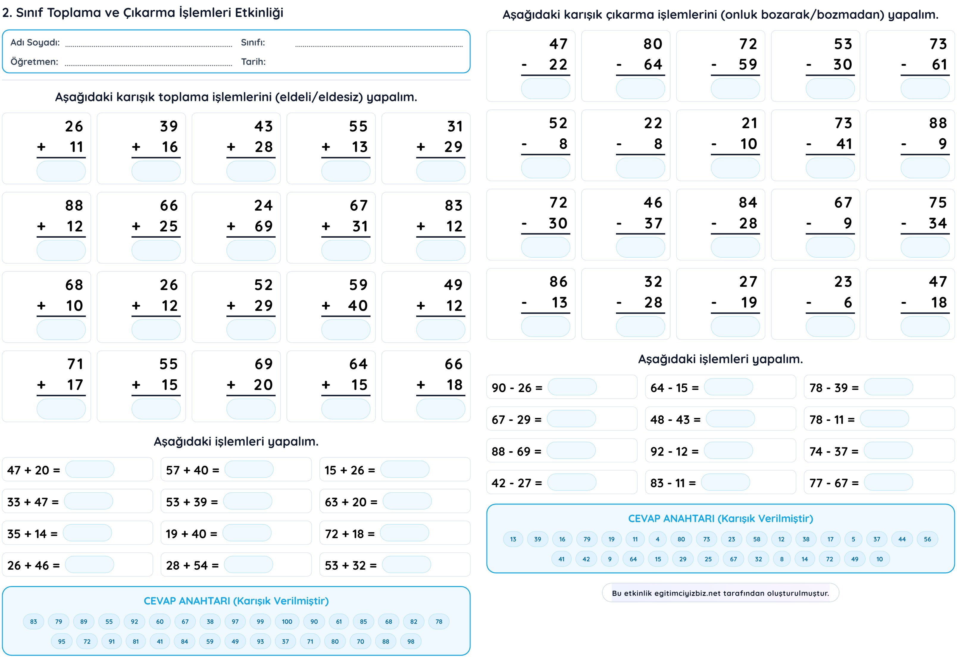 2. Sınıf Karışık Toplama ve Çıkarma Etkinliği