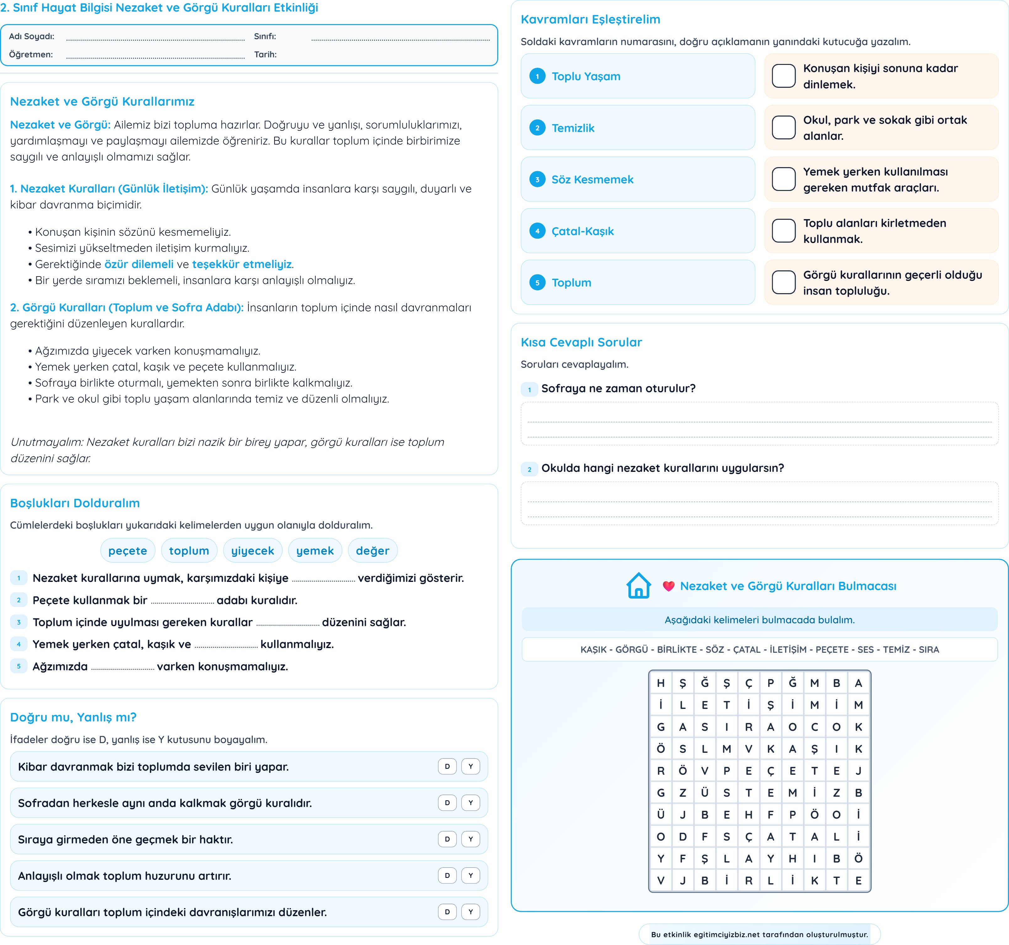 2. Sınıf Hayat Bilgisi Nezaket ve Görgü Kuralları Etkinliği konusu için hazırlanmış PDF.