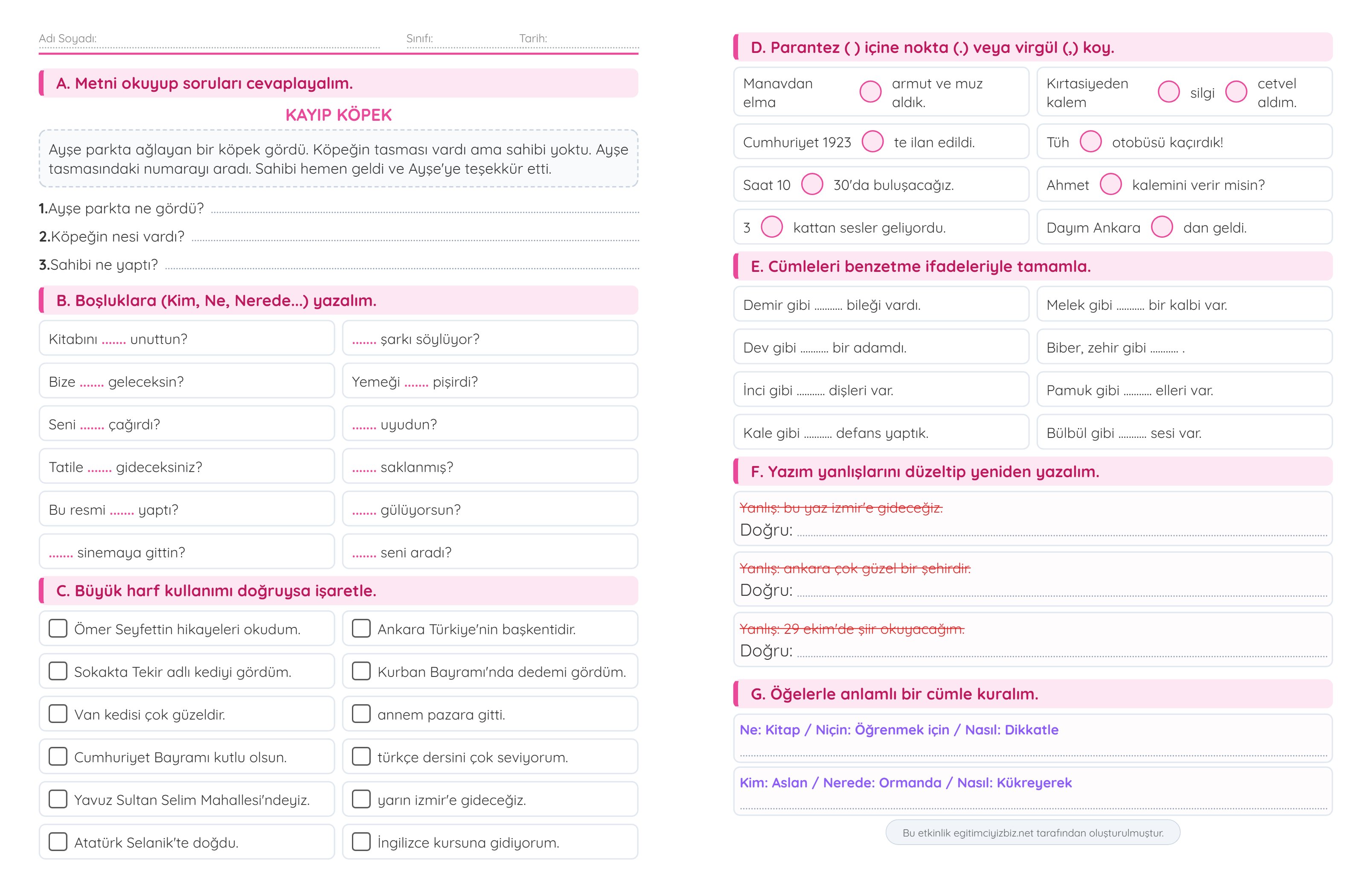 2.Sınıf Türkçe Etkinlik ve Testler