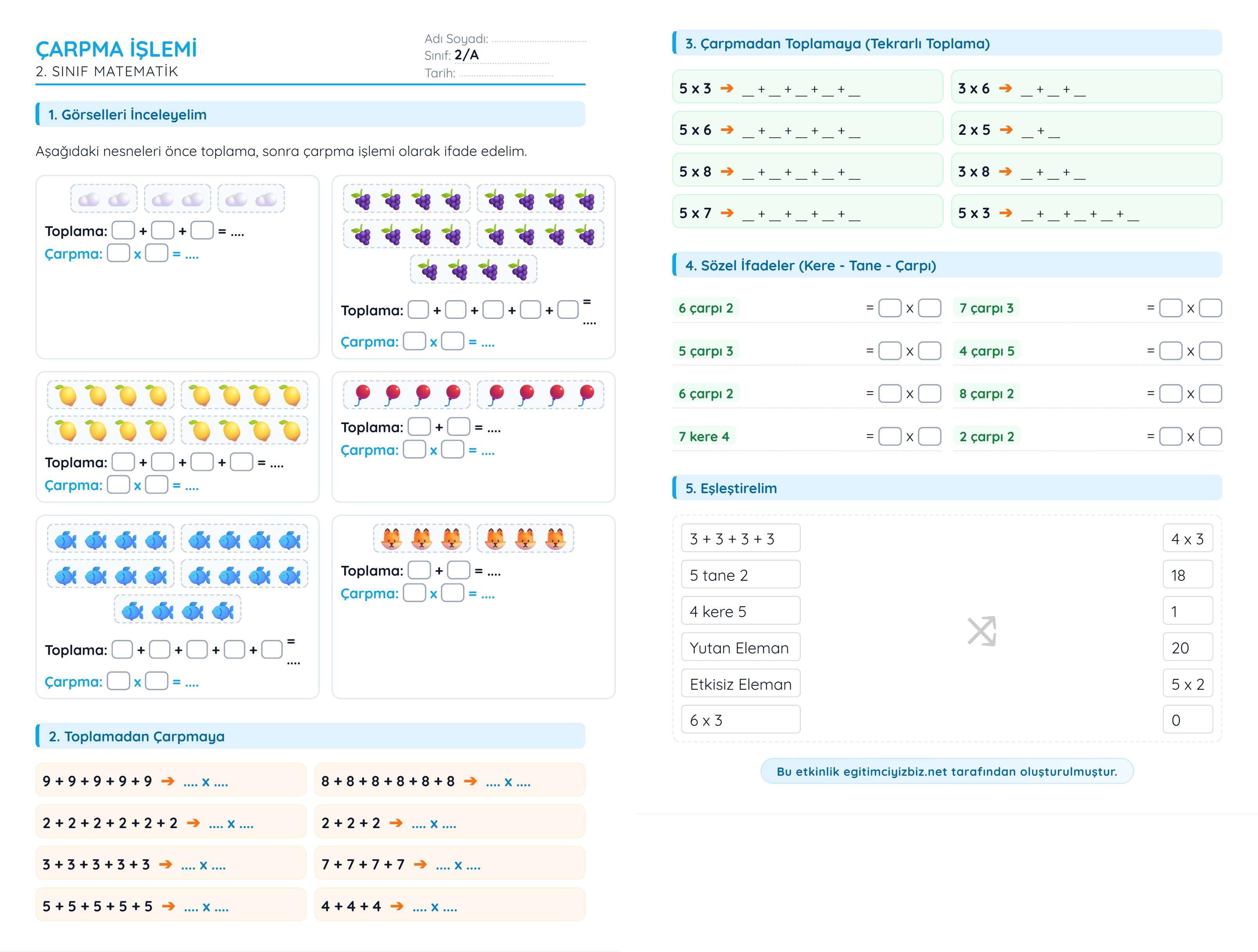 2. Sınıf Matematik Çarpma İşlemine Giriş Etkinliği konusu için hazırlanmış PDF.