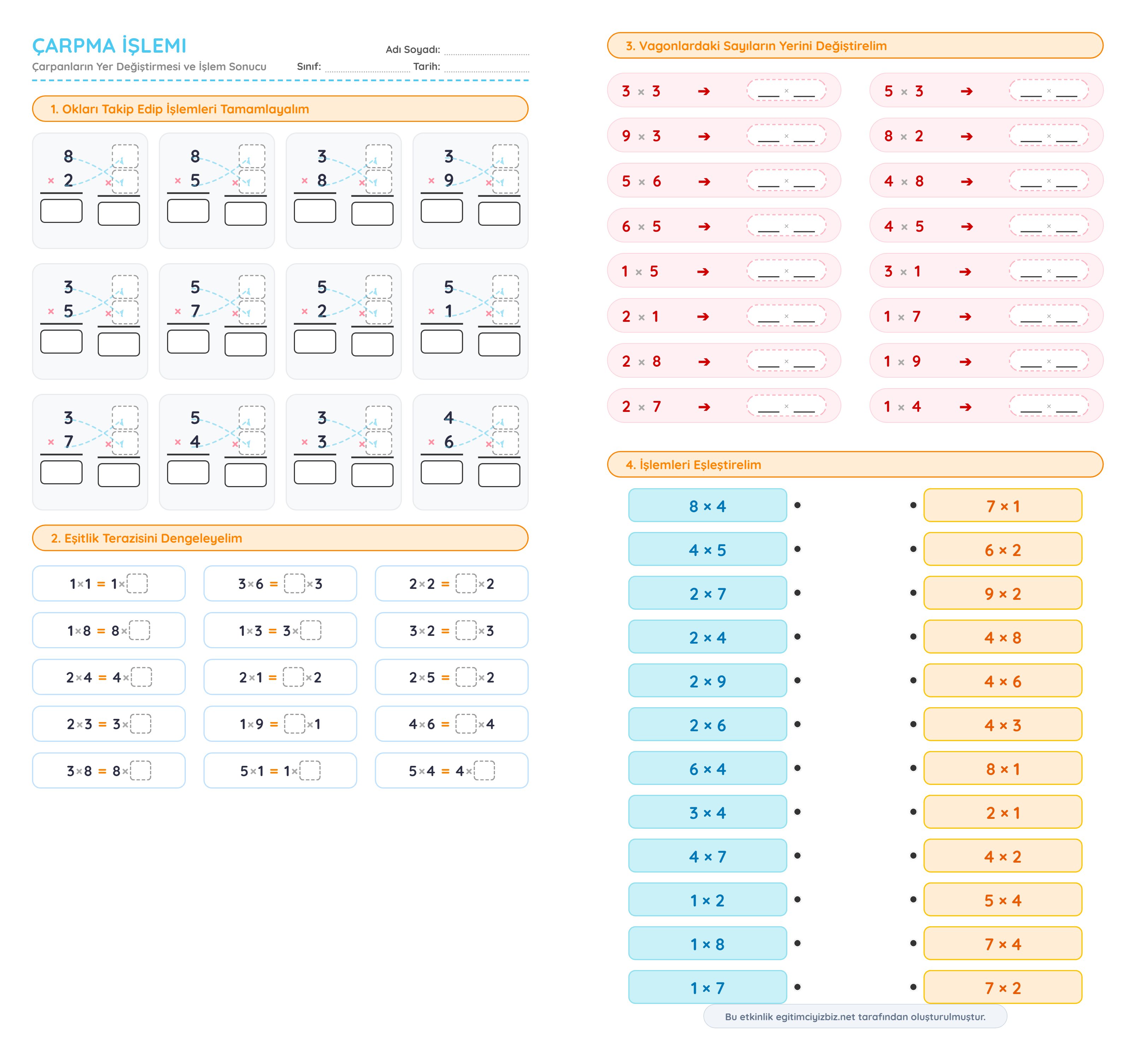 2. Sınıf Matematik Çarpanların Yer Değiştirme Etkinliği konusu için hazırlanmış PDF.