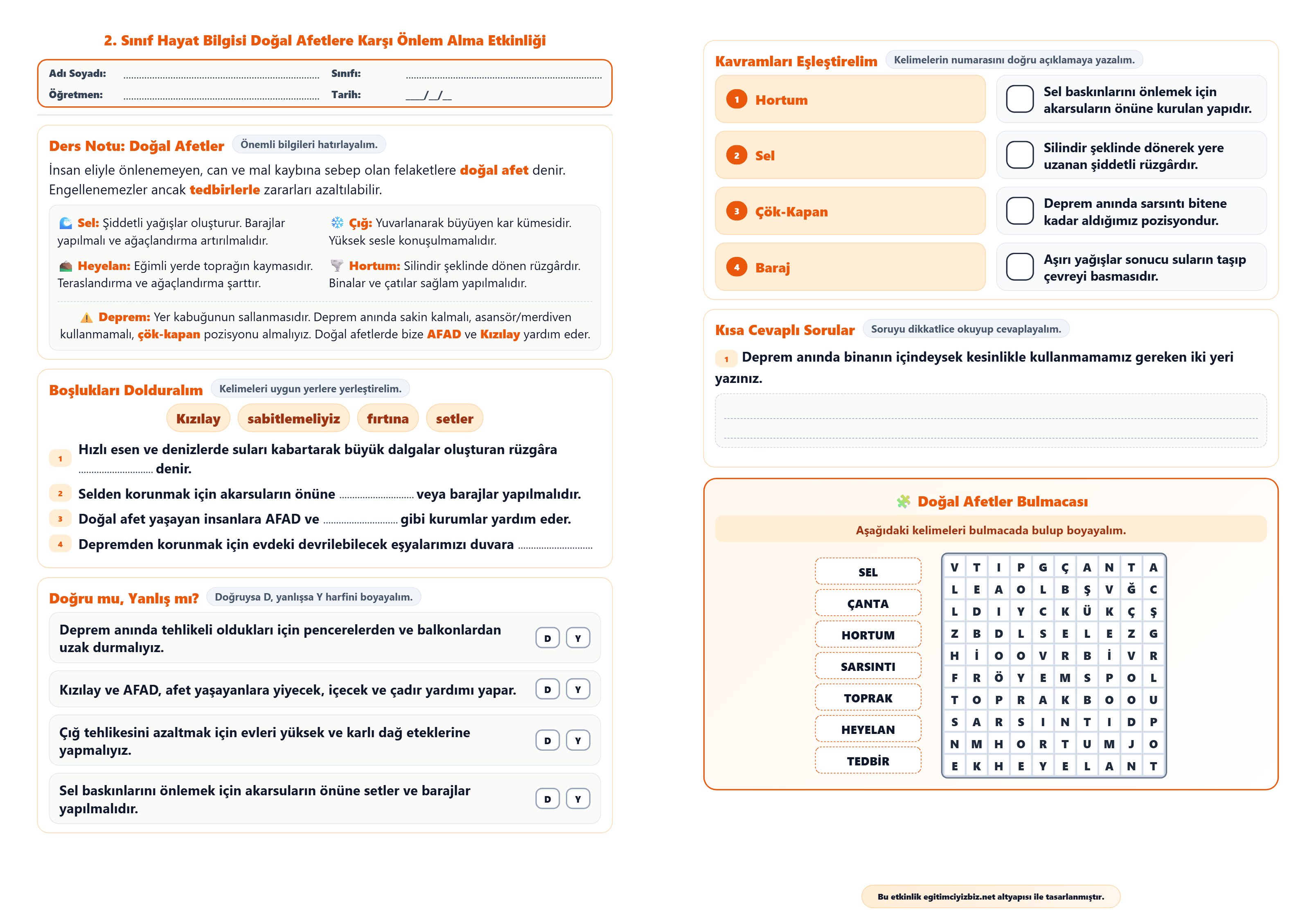 2. Sınıf Doğal Afetler ve Önlemler Etkinliği konusu için hazırlanmış PDF.